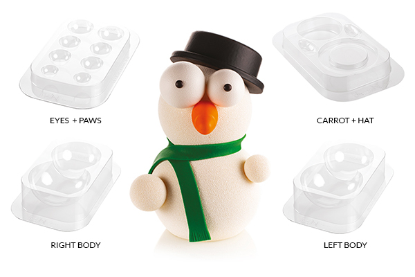 Zestaw 4 form do czekoladowych elementów wykonanych z wysokiej jakości formowanego termicznie tworzywa sztucznego. Dzięki użyciu form do czekolady Silikomart możemy wykonać dekorację z czekolady w postaci bałwana 3D.