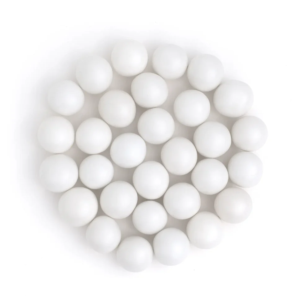 Duże białe kule posiadające w środku chrupkę, pokryte czekoladą o przepysznym smaku, otoczone perłową, białą cukrową powłoką. Kule mają ok. 17mm średnicy.