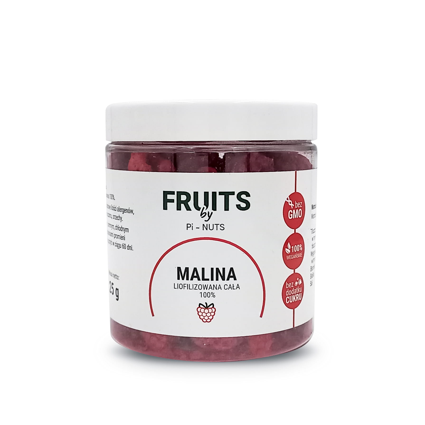 Malina liofilizowana cała pakowana jest do opakowań po 25 g. W opakowaniu 100% malina liofilizowana. Trwałość produktu – 12 miesięcy.