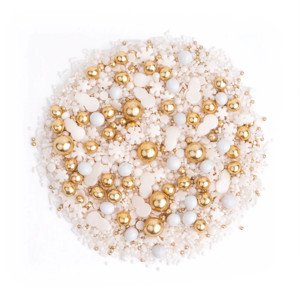 SNOW GLOW to najdelikatniejszy z naszych świątecznych mixów. Stworzony wyłącznie z miękkich elementów: czekoladowych kulek, perełek z chrupką i drobnych cukrowych akcentów. Dominuje biała baza, wzbogacona o czekoladowe śnieżki i urocze kształty: śnieżynki, bałwanki i gwiazdki. Całość dopełniają złote czekoladowe kule i perełki, które rozświetlają ten zimowy krajobraz jak świąteczne światełka.