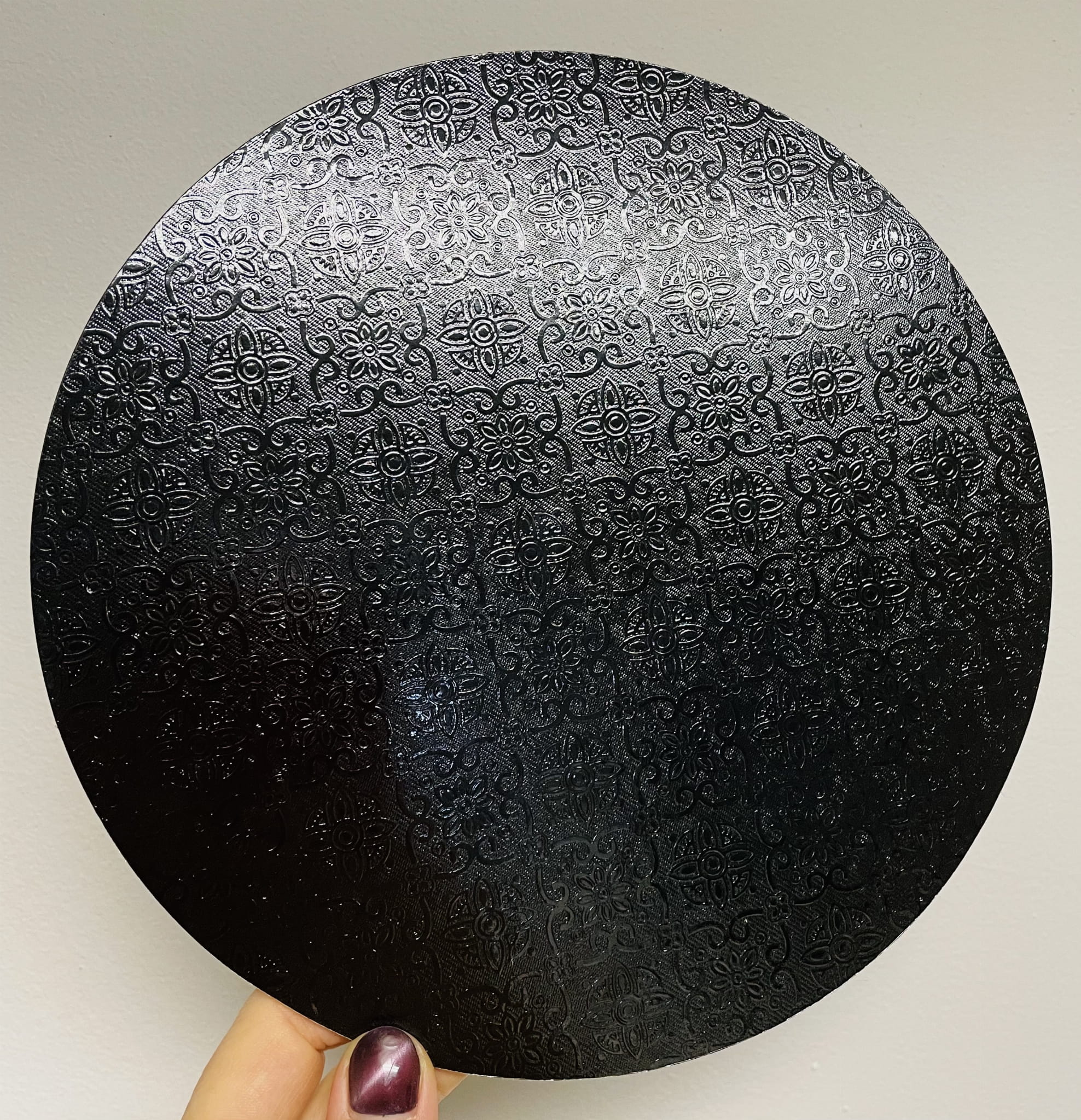 Cienki dwustronny podkład. Z jednej strony czarna folia do kontaktu z żywnością, z drugiej strony biała folia do kontaktu z żywnością. Materiał wypełnienia to prasowana tektura - bardzo sztywna. Można zastosować jako podkład do lżejszych ciast lub jako przekładka do tortów piętrowych.