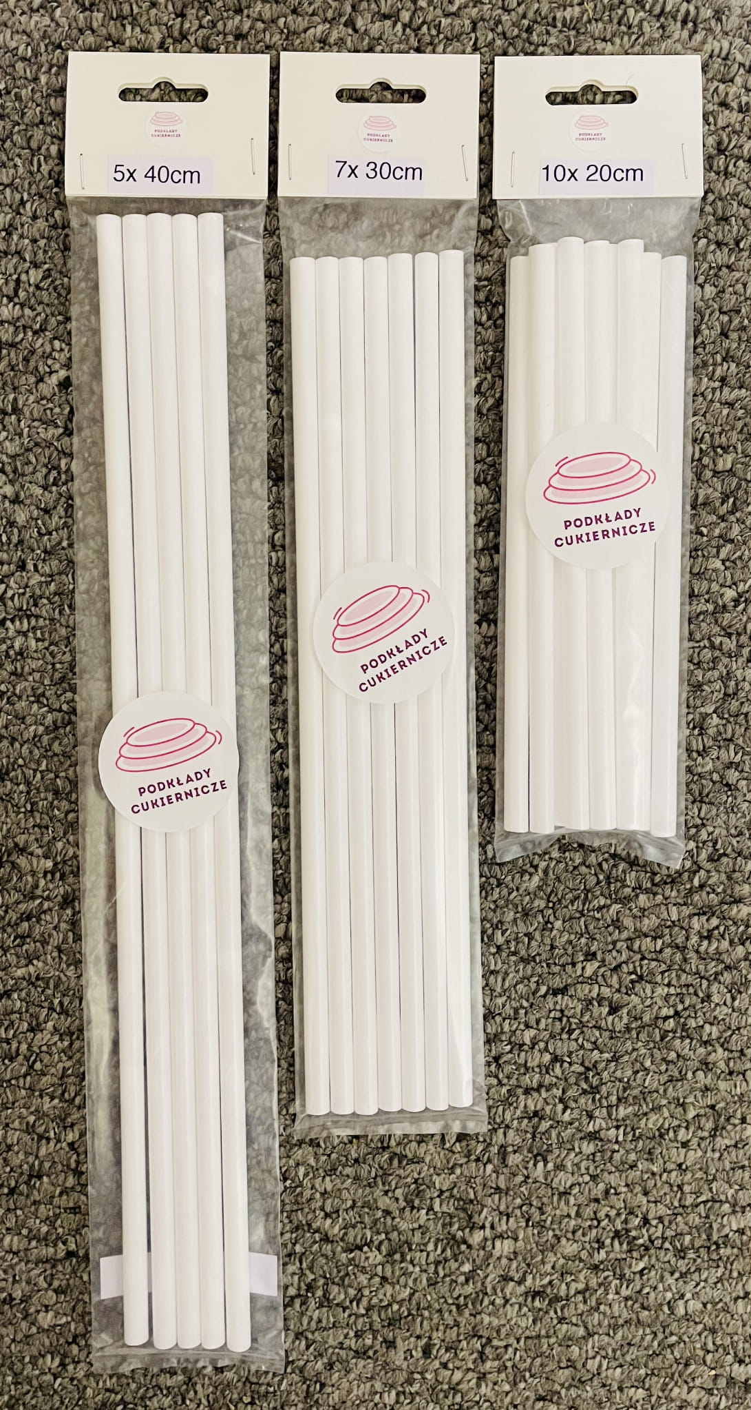 Wspornik/rurka, ułatwiająca montaż piętrowego tortu. Sztywna, biała z materiału posiadającego atest do kontaktu z żywnością.