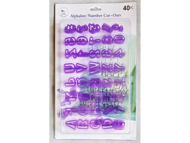 Alfabet cukierniczy składający się z 40 elementów: litery, cyfry i znaki interpunkcyjne.